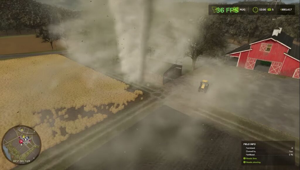 As for the weather conditions, in Farming Simulator 25, they are very diverse. For example, hail can destroy crops. Since such mechanics were added to the game, then there will be a revelry for modders, for example, they will be able to make a mod for crop damage from high humidity and drought, or even add locusts. Tornado! There is even such a natural disaster. A tornado destroys both crops and trees, but it looks, to put it mildly, not very good. It does not affect the player, buildings, or equipment. A strange tornado :)