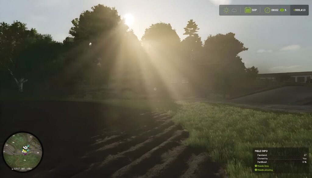 Wherever you film your review of Farming Simulator 25 – on PS5 or Xbox, you will notice the graphics everywhere. They are as plastic as in the previous parts of the game. However, the lighting from the sun in the morning haze and fog look very nice and do not steal FPS. Traces from tractor wheels on the fields look very natural: the soil is pressed down depending on its type and the weight of the transport itself.