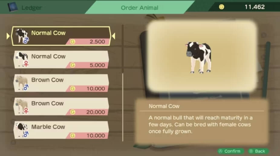 - Brown Cow (Female): 20,000 G (produces Brown Milk for Butter);