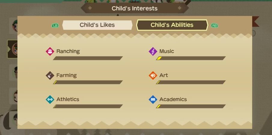 The child’s basic interests are shaped by the spouse’s choice and the player’s interests. For example, if a player marries Gustafa who has a love for music and nature then that kid may naturally like music too. Nonetheless, as the game continues, players can still somewhat alter their child’s career path.