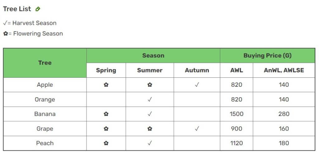 In addition to crops, you can also grow fruit trees. Each tree produces fruits for one season every year. You can buy tree seeds at Vesta’s farm and plant them in any of your 3 fields. Before producing the fruits, the tree will flower. Trees, like crops, benefit from regular fertilization and need to be watered often, especially in the summer.